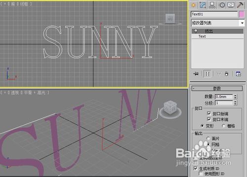 2. 選擇3dmax2010的“文本”工具后,會(huì)出現(xiàn)文本框;在文本框中輸入“SUNNY”的字樣。并移動(dòng)鼠標(biāo)到前視圖上點(diǎn)擊一下,以在視圖中顯示你輸入的內(nèi)容。如圖2所示: