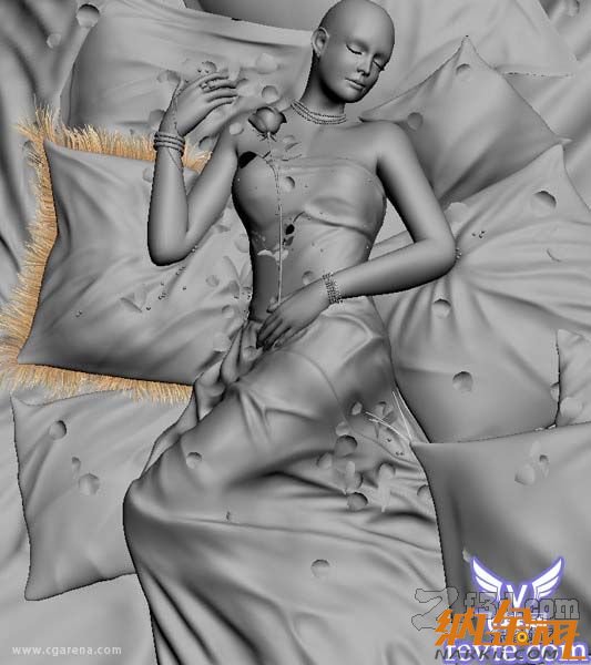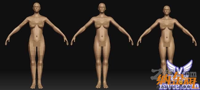 我完成了最終的姿勢后,給她穿上了在max里通過基本網(wǎng)格創(chuàng)建的禮服,如下圖所示。然后一步步的添加細(xì)節(jié)。從解剖學(xué)和姿態(tài)學(xué)來說,制作衣服下面有實(shí)體感覺很重要。