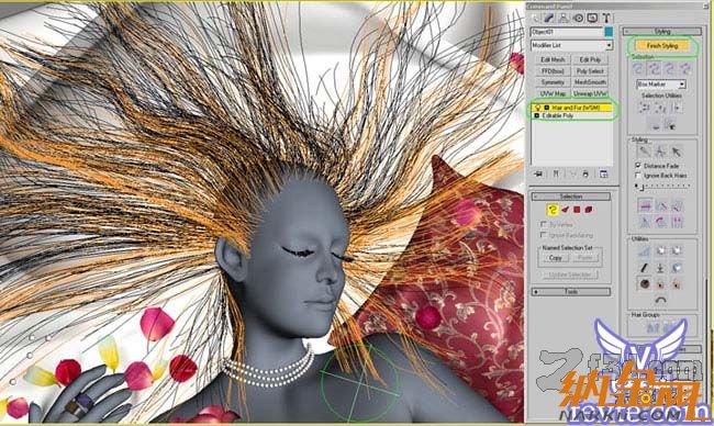 2、選擇所有必要的面,在命令面板下的編輯毛皮選項(xiàng)中選擇毛皮。旋轉(zhuǎn)拉伸器,開始模擬并通過放寬減少進(jìn)一步的扭曲變形。
