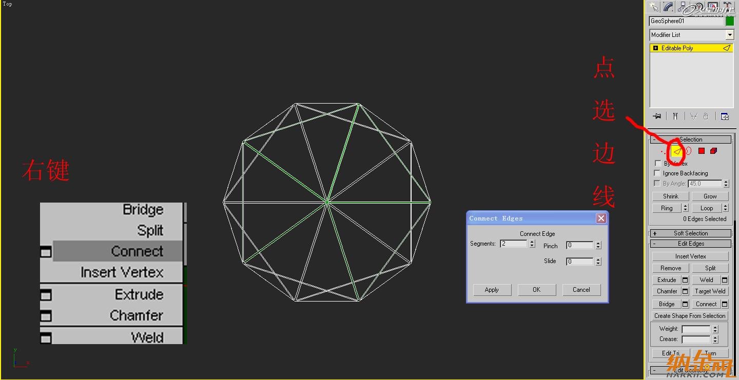 再把球體轉(zhuǎn)化成poly編輯,全選所有的邊線。(圖02)