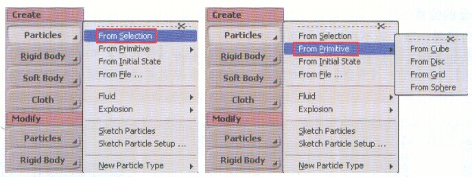 在Softimage XSI中,發(fā)射器可以自己創(chuàng)建發(fā)射體,也可以直接創(chuàng)建。無論是自己創(chuàng)建還是直接創(chuàng)建發(fā)射體,都在Create→Particles下的命令中創(chuàng)建。其中From Selection【從選擇物體】是把自己創(chuàng)建的物體作為發(fā)射體.From Primitive【從幾何體】是直接創(chuàng)建發(fā)射體。如圖所示為粒子創(chuàng)建發(fā)射體的兩種形式。