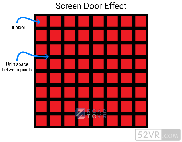 在Rift和Vive等第一代VR頭顯中,紗窗效應(yīng)可能是最為明顯的偽影。從技術(shù)上來說,紗窗效應(yīng)是“低填充系數(shù)”的結(jié)果,而“紗窗”的命名是因為這看起來像是透過紗窗這樣的精細網(wǎng)格來感知影象。