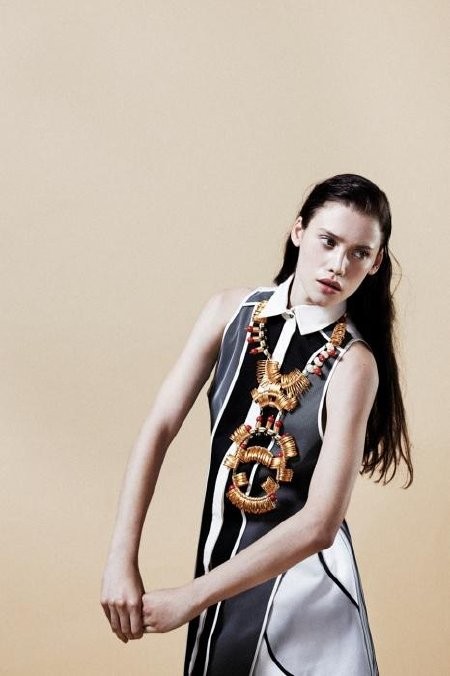 這位曾被《ELLE》雜志英國(guó)版網(wǎng)站提名為「2011 年時(shí)尚新星」(Rising Star of 2011)的年輕設(shè)計(jì)師擅長(zhǎng)玩弄筆挺立體的剪接線及虛與實(shí)的布料,而相對(duì)于服裝利落的簡(jiǎn)潔線條,Kirsty Ward 的飾品可真是繁復(fù)地像非洲女性所佩帶的巨大首飾,這些圈上多彩金屬線和珠子的項(xiàng)鍊可都是 Kirsty Ward 一手纏繞出來(lái)的,她甚至還讓這些小飾品們爬上衣服,增添飾品與服裝的連結(jié)。
