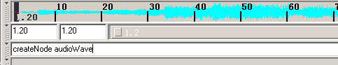 然后,我們在命令行中輸入“createNode audioWave”,這時我們看到在時間條里出現(xiàn)了音樂的波形。