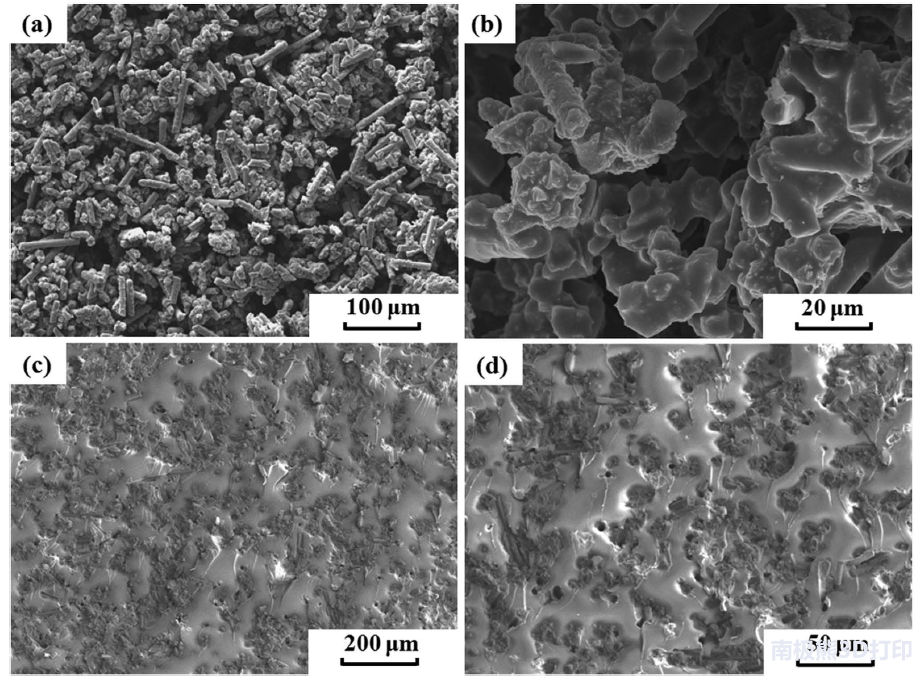 圖2. CF/PA12/EP三元復(fù)合材料素坯表面(a,b)和樹脂填充后截面(c,d)的SEM圖像