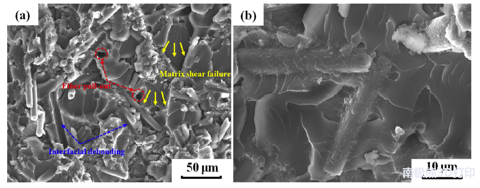 由圖3.a可見,復(fù)合材料表現(xiàn)出典型的脆性破壞行為,斷裂表面具有剪切變形的粗糙形態(tài)。EP基體的變形和裂縫在不同方向上傳播(如箭頭所指),裂縫擴(kuò)展被類似CF / PA12富集域阻擋并被迫改變軌跡,提高了復(fù)合材料的斷裂韌性和強(qiáng)度。在破壞表面上可以觀察到纖維拉拔,界面剝離和基體破壞這三種纖維破壞機(jī)制。對(duì)比其他幾種SLS制備的聚合物基復(fù)合材料更高的拉伸和彎曲強(qiáng)度可歸因于:(1)CF的均勻分布;(2)由機(jī)械聯(lián)鎖和化學(xué)相互作用引起的CF和EP之間良好的界面結(jié)合,如圖3.b。